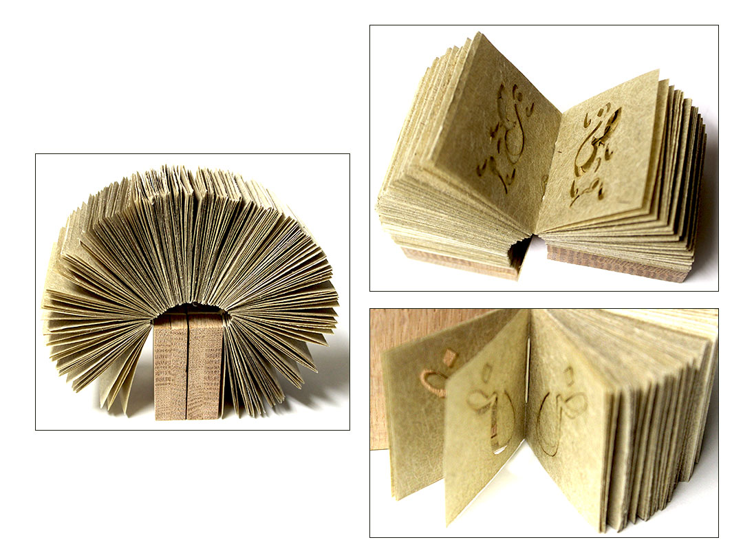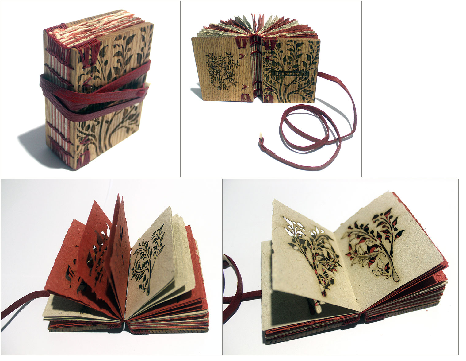 2 x 2 x 1.5" miniature book. Laser-cut mould-made Johannot paper. Twenty sections of 2 folios per section. Handbound in laser cut and engraved wooden boards with Coptic binding of linen thread. Signed and numbered by the artist.