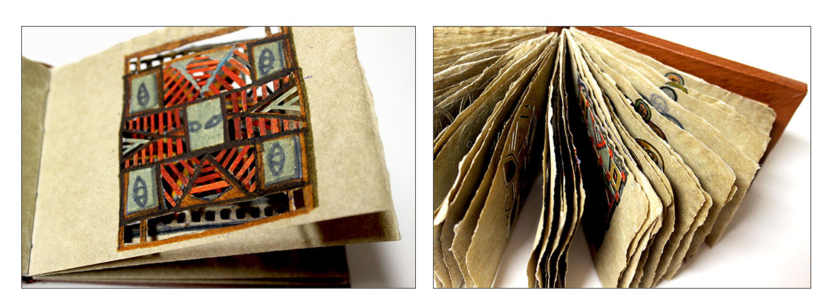 Islam Aly: "Ethiopian Talismans were inspired from the Ethiopian healing symbols, believed to heal people both physically and emotionally. I used one symbol on each section. The shapes of the symbols inspired me to cut and color each page in a unique way. The paper is made from over-beaten flax paper with deckle edges to have the appearance and texture of the parchment that was historically used in the Ethiopian books."