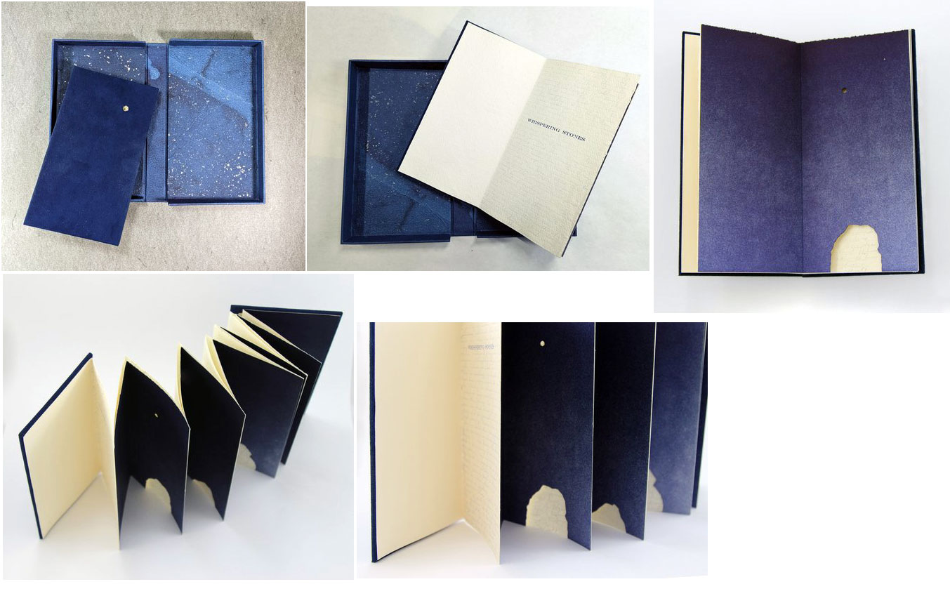 5” x 10.25” x 1”; 12 pages including pastedowns. Letterpress polymer plates and mono-printed forms. Hand paper-cutting in double-layer carousel-style false accordion binding. Papers: handmade Khadi Natural Cotton, Thai Kozo natural for the back layer, and cave paper to create binding. Covers made of Ultrasuede panels with a natural mica stone inlay. Includes clamshell box with two styles of indigo-dyed Cave Paper, one includes dispersed mica flecks. Signed and numbered. Written in collaboration with Julia Alpers. Illustrated, letterpress printed and bound by Rhiannon Alpers of Gazelle and Goat Press.