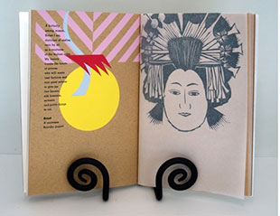 9.25” x 7.25”; 36 pages. Type is Cairo. Japanese calligraphy by Mitzuko Santo. Printed on a 10 x 15” Chandler & Price platen press. Silk screen images. Text paper is Japanese Toyo Kurumi. Cover is Arches. Overlay are UV Ultra II. Tip sheets are Okawara Hand made. Press check masks are printed on Mohawk superfine cover. Two texts: reading from front to middle: second reading from back to middle. Japanese stab binding. Signed and numbered by Anderson.