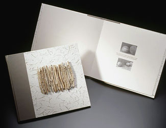 6 x 6"; 20 loose leaves bound with ribbon tie that are laid in a quarter-cloth codex case of paper, handmade by Tom Leech, over boards. A tile (2.75" square) with title blind embossed has been attached to the front board of the case. Text letterpress printed on Fabriano Artistico. Colophon on back pastedown. Book design by Gail Watson.