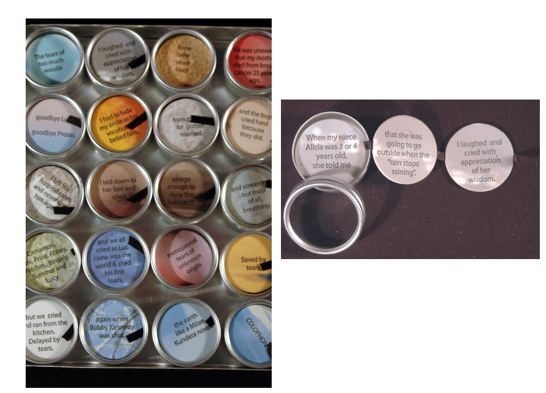 5..5 x 6.5 x 1.5"; 20 pages, which are actually aluminum specimen containers each of which contains a vignette. Letterpress printed from polymer plates on an 1887 Pearl platen press. Set in Myriad by Robert Slimbach and Carol Twombly Archival inks and pigment. Text printed over inkjet-printed photographs using archival inks on Crane’s Lettra, 110# cover, which has been die cut into 1.25” circles. Seventeen of the containers contain short accordion books, which pull out with the help of a ribbon; three containers have text only on one circle, which does not come out. Housed in hinged metal container with bandoleer of cloth-covered board with a polymer casting affixed, metalized and rusted to look like the seal of a municipal water company. Hand-bound.