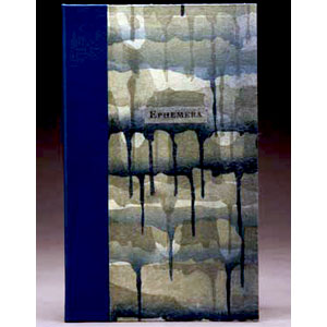 7" x 4" closed, extends to 56"; 16 pages. Etching, woodcut and letterpress on various Japanese Nishinouchi papers, and artist-made blue kozo. Accordion fold structure. Housed in a folder of blue silk moire covered boards. Handset Century, 14 pt type. Printed, bound and published by Blue Heron Press at Constellation Studios, Lincoln, Nebraska. Signed and numbered by the artist.