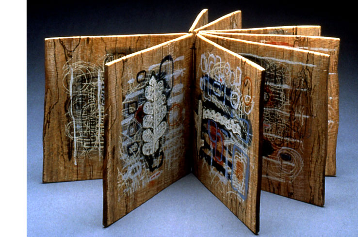 5.25 x 7.25"; 16 pages. Screenprint, watercolor, and etching on gampi paper. Includes collage and beeswax on brazilwood veneer pages. Pasted binding. Housed in decorative wooden handmade box. Leather tie closure.