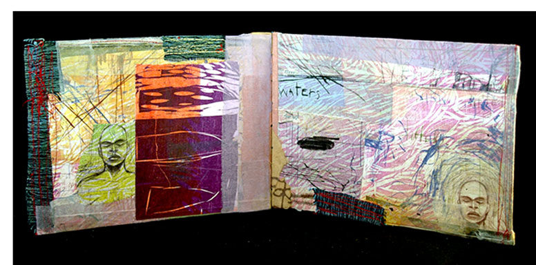 12 x 6.5"; 4 pages. Woodcuts/intaglio printed and collaged on a variety of papers. Bound on sewing machine with cloth.