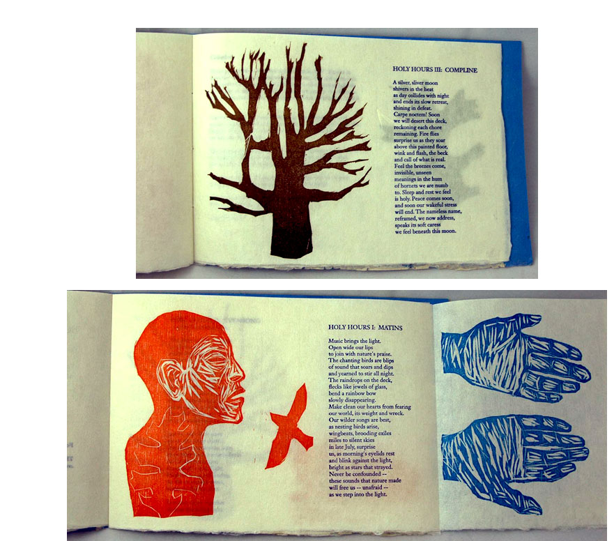 12.5 x 10.25"; 36 pages. Woodcuts handprinted on Hiromi Yugen paper and Zimbabwe screenprint. Printed using American Unical type. Handbound using Japanese stab binding with waxed linen thread.