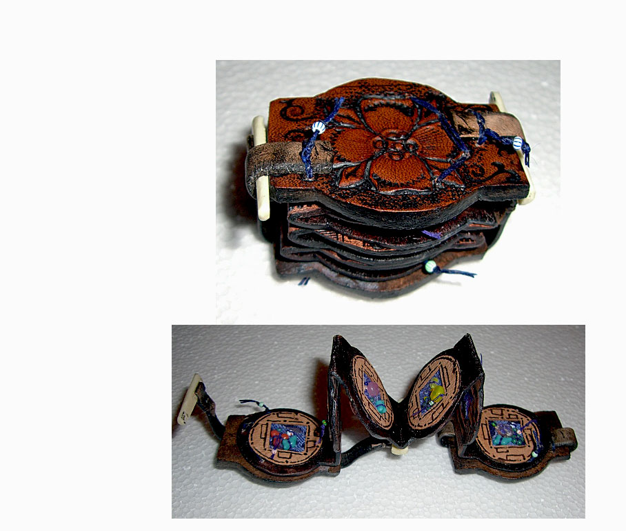 2.25 x 1.5 x 1"; 6 leaves. Miniature accordion fold. Net appliqué pages embroidered with glass flower beads. Painted leather covers secured by bone closure pins.