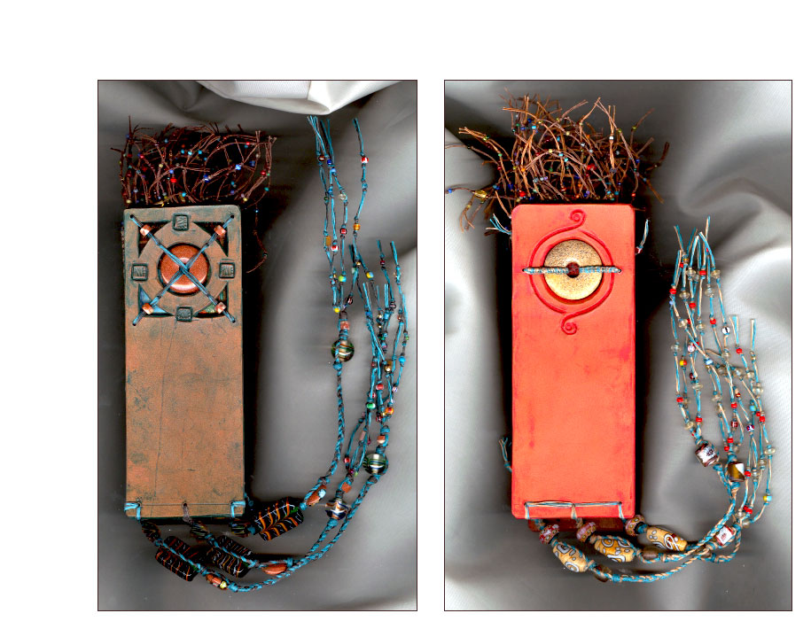5 x 4"; 12 pages. Materials: linen, cotton, leather, glass, polyester, acrylic, paint, bronze foil. Cloth pages accented with bead and thread tassels. Painted leather covers with wooden spine accented with beads and tassels.