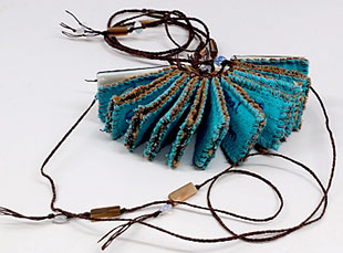1.25 x 3 x 2.75"; 22 cloth pages. Miniature. Each leaf with recto of turquoise cotton embroidered with text and embellished with scrimshaw mother-of-pearl discs; verso of appliqued gold/green fabric, hand-marbled cotton, and commercial cotton print. Bound in covers of re-purposed shell pendants incorporating white mother-of-pearl and abalone shell. Single-needle Coptic binding with waxed brown polyester cord plus braided endbands and decorative terminals finished with shell and opal glass beads. Closure of braided ties. Longer braided cords knotted with abalone shell and opal glass transforms book into necklace.