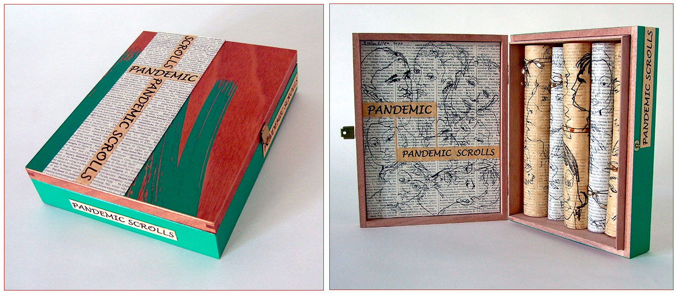 Evelyn Eller: "Five scrolls, pasted into a box, that contain my drawings of faces of the dead. These drawings are superimposed over the list, from the New York Times, of those deceased from May of 2020. Unfortunately, the names of deceased due to the pandemic continue to rise at an alarming pace."
