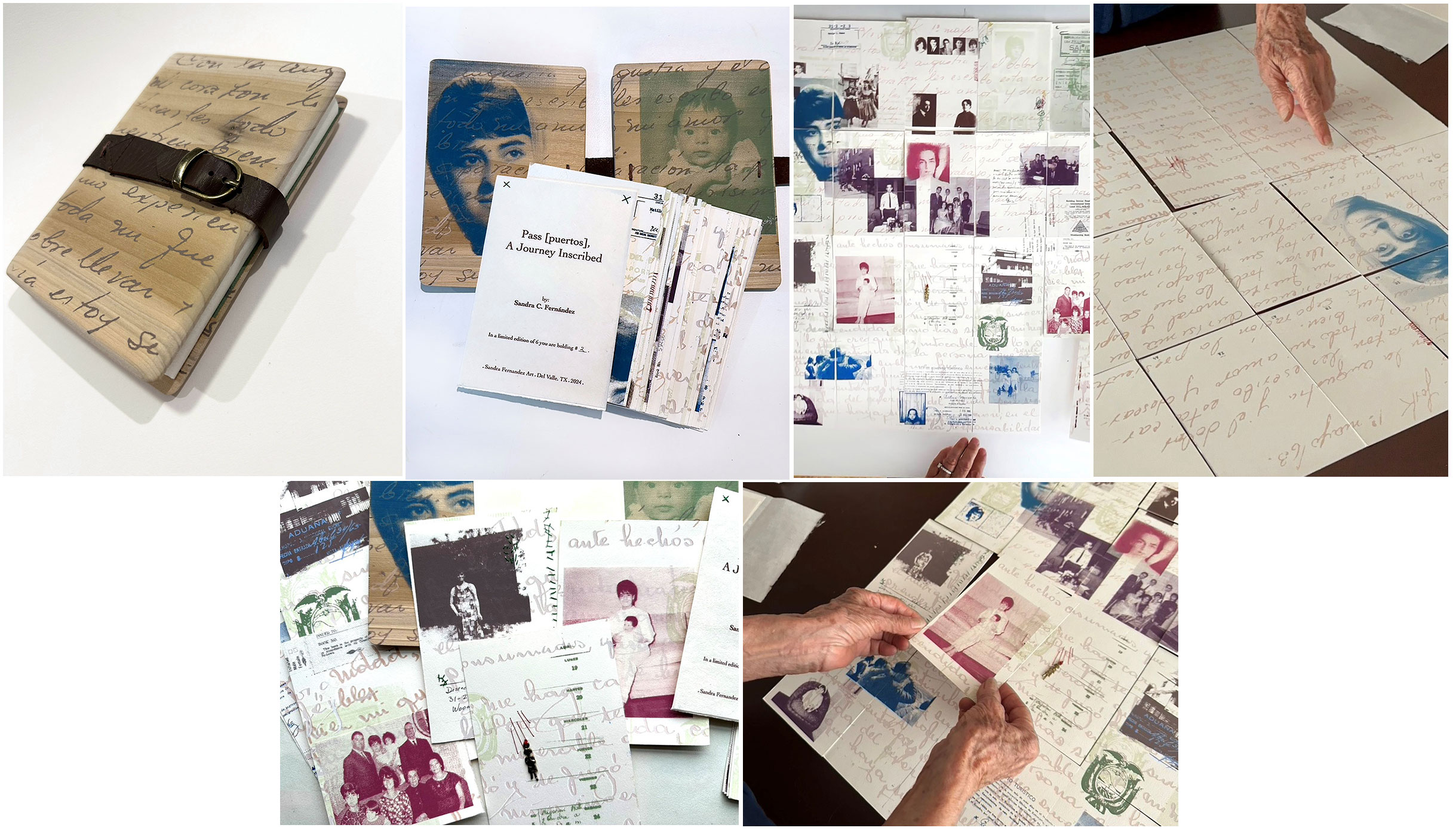Sandra C. Fernández: "The cyanotypes are of my grandmother. The text is of different things: front right, a letter from my grandfather to me (in Spanish). I added this letter to the front of her 'house' because he was the center of her life; the text on the front left is a letter I wrote when I was a child. My grandmother and grandfather played a very important role in my life as a child. They brought me up together with my mom.