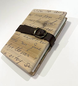 5.25" x 7" x 5.5” box containing a crocheted element and an accordion book. Lid is attached via leather straps. Spanish text covers all the surfaces of the box. A crocheted element is suspended in the interior via red threads affixed to the walls. A nine panel accordion book is laid atop the crocheted piece. On the lid top, anchored with red thread, is a crocheted piece with red willow twigs intertwined. Materials: Wood, Vandykes, text from 16th-century Spanish writings on the Americas, various handmade and Japanese papers, inkjet photographs, antique crocheted application, waxed linen thread, red willow twigs, leather, and silk threads. Signed by the artist.
