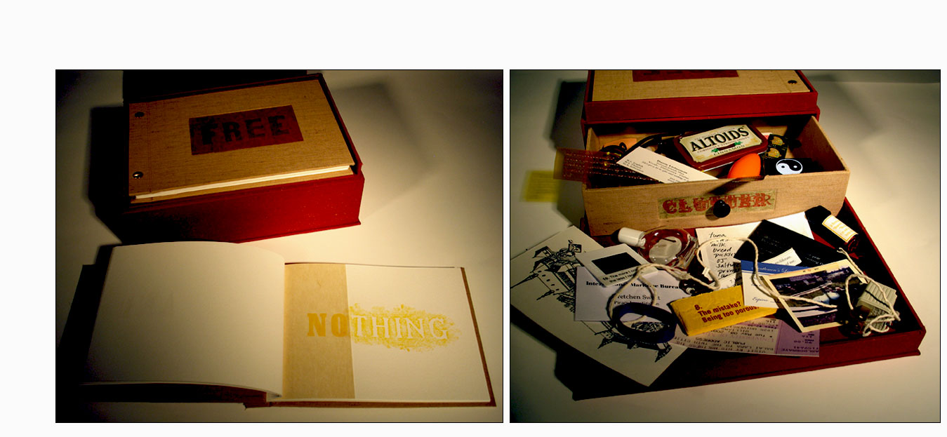10 x 6.75 x 3.75" cloth-covered modified clamshell box. Paper title inset on top. Box houses two books: FREE and CLUTTER. FREE: 9 x 6", 21 leaves; letterpress printed; cloth-covered boards with metal screw binding. CLUTTER: 9.25 x 6 x 2" drawer with knob pull, 16 numbered items; other miscellaneous items.