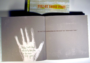 Wendy Fernstrum: "From Right to Left is an artist book about the effects of changing one's dominant hand. Through the personal narrative, I tell the story of why and how I switched from my right to my left as my dominant hand. I wrote this narrative using both my right and left hands, then scanned the handwriting, made photopolymer plates, and printed it letterpress.