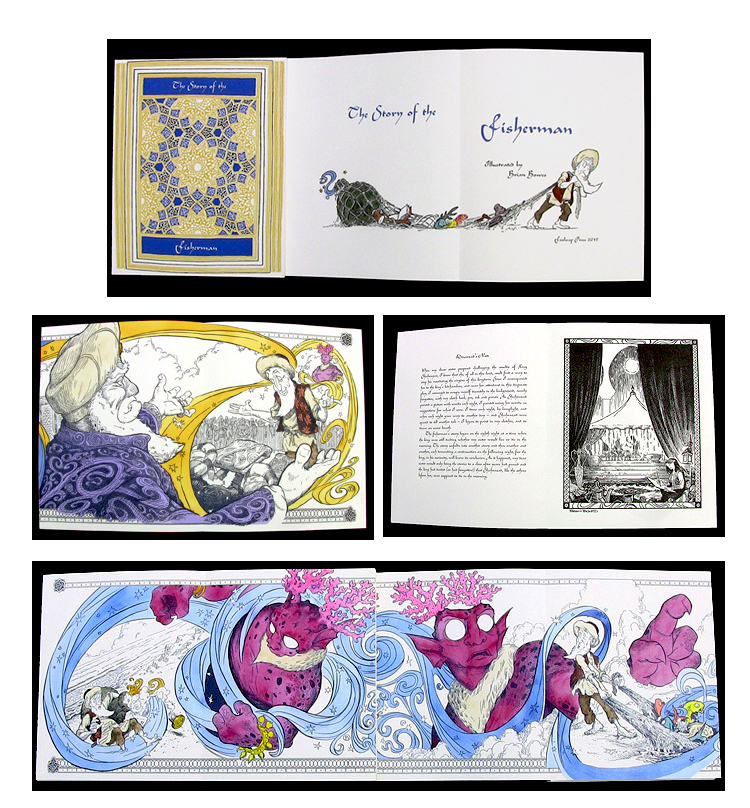 "For this edition, illustrator Brian Bowes has transformed Shadrazad's narration into a panorama of imposing images setting before the reader a visual extravagance of place and time and character. Mr. Bowes is the former Illustrator Coordinator for San Francisco North & East Bay Region of the Society of Children's Book Writer's and Illustrators (SCBWI). He is an illustrator, graphic designer and art instructor. Once printed, the illustrations are hand colored in a French method called pochoir where paint is applied with a brush through cut-out stencils.