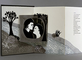 6.5 x 9"; 28 pages including pastedowns. Double-sided accordion. Image pages printed relief. Fabriano Artistico Traditional White hot-press watercolor paper with a variety of colored papers used in the pop-up sections. Tahoma typeface. Bound in cloth boards. In cloth slipcase. Numbered. Includes 8 page pamphlet of Production Notes.