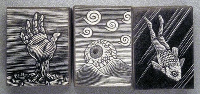 Heavenly Monkey: "This project is Minegishi's most personal book work to date, merging and juxtaposing his interests in fine art printmaking and hand-crafted books. It is also his most ambitious publishing project to date, hence the small edition of just 25 sets, with five reserved for distribution exclusively in Japan. The book and portfolio (both measuring 8.5 x 7 inches) in each set feature descriptive colophons, numbered and signed by Minegishi (English in the book, Japanese in the portfolio). The core of the project consists of six wood engravings (each about 3 inches square) that tell a sequential narrative about the adventures of a family of three black boxes. This story is told, with spare text, in a single signature book.