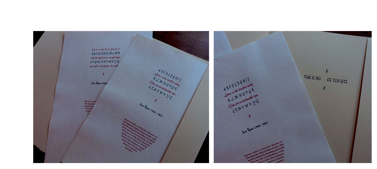 10 x 15"; 30 pages. Set in Centaur type. Printed on dampened Arches wove paper by Rollin Milroy with the Heavenly Monkey handpress. Martin Jackson's calligraphy reproduced from polymer plates, printed in red.