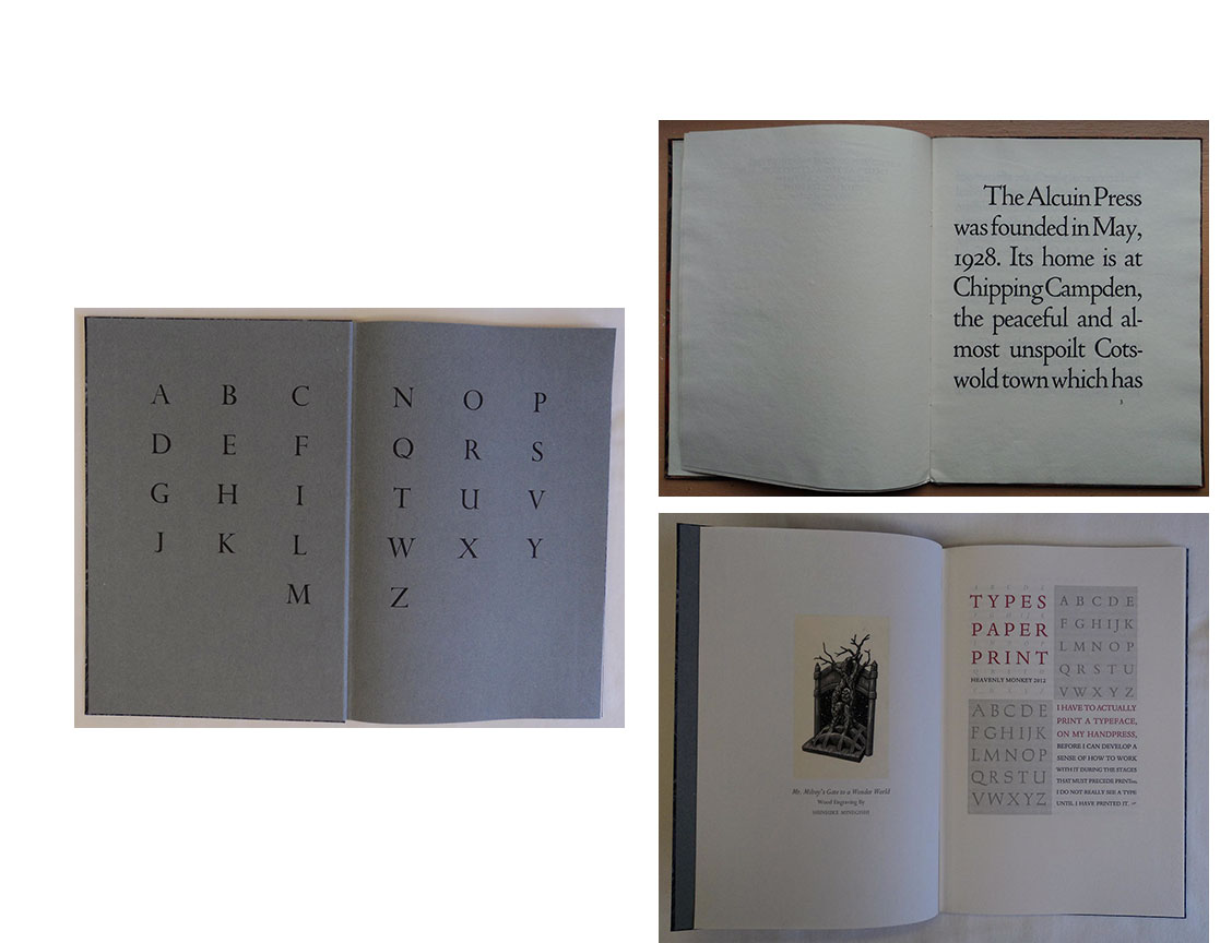 Heavenly Monkey: "A type specimen book displaying the nine roman and eleven italic faces … that will form our core repertoire for the next five to ten years. It's an opportunity to use a few faces that have not been printed at the HM studio before, and to refine our work with some others. Just for fun, there's also an allusive new wood engraving cut and printed on gampi by Shinsuke Minegishi. Each face is displayed on a full page in three text sizes. There is a three page forward written by the printer, discussing why these faces have been chosen, and how they will be used (and printed) at the studio. The foreword also touches on the importance of paper, and how it can affect a type's appearance, especially when printed on the handpress. To illustrate the point, ten copies will be issued with all of the samples printed on three different papers (all damp, as is our custom), bound together sequentially, for comparison's sake. The remaining forty copies in the edition will include one duplicate leaf printed on handmade paper.