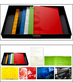Red: Photographs printed with polymer plates in letterpress using inks in several "lipstick" colors; 60 pages, bound in printed paper over boards.