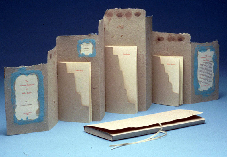 "Mary Elizabeth Jane Colter was the architect of many of the now famous buildings on the south rim of the Grand Canyon, including Hopi House, Hermit's Rest, Lookout Studio, and Desert View. The book reflects the colors and textures of the land, the turquoise associated with the region, and Colter's architecture; fully open, it forms a pueblo shaped structure. Avadenka has written three booklets, 'locked doors,' 'foundation' and 'opaque windows,' tucked into the book in slipcases shaped like stairs, suggesting a pueblo's multi-storied architecture. The booklets tell Colter's story." [Beyond the Text: Artists' Books from the Collection of Robert J. Ruben by Yvonne Korshak and Robert J. Ruben]