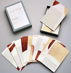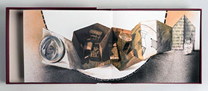4.75 x 6.75 x 1.5"; 14 pages. Accordion structure. Letterpress printed using wood types, metal types, and photopolymer plates on hanga-shi paper. Paper-covered boards. Signed and numbered.