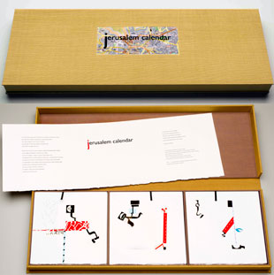 Lynne Avadenka's Jerusalem Calendar by David Stromberg, The Arty Semite: "Detroit-based printmaker and book artist Lynne Avadenka, whose previous projects have dealt with Hebrew and Arabic typography, exhibited recent works this week at the Jerusalem Print Workshop in the city’s Musrara neighborhood. The works are a culmination of her fellowship at the American Academy in Jerusalem.