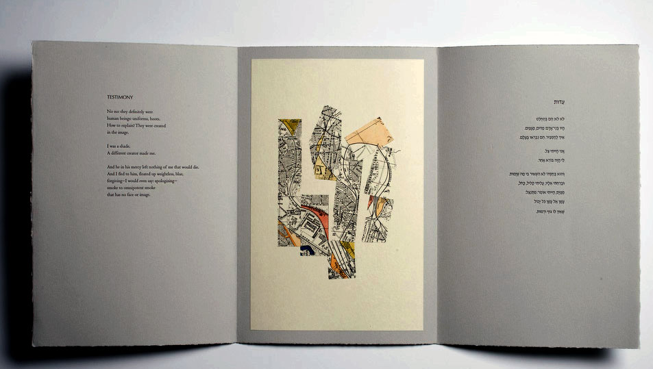 8.75 x 12” Handsomely printed from polymer plates in Garamond and David types on Frankfurt paper. A full-spread etching, printed in black, green and gold, suggests two windows, two vantage points, and is the centerpiece for the mirrored texts. Handsewn. Twinrocker Sagebrush cover. Signed.