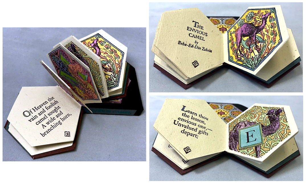 Carol Schwartzott: "I found some wonderful tiny boxes at Pier I. They were made in India and one had an Elephant on it, and the other a Camel. I bought all they had! I then proceeded to create a tiny book that would fit inside. I hand-printed (letterpress) and then hand-colored 100 of each of these, but only 25 or so were the 'specials' placed inside of those tiny boxes that I re-painted and gilded. I liked ' The Blind Men and The Elephant' so much that I actually printed another edition offset."