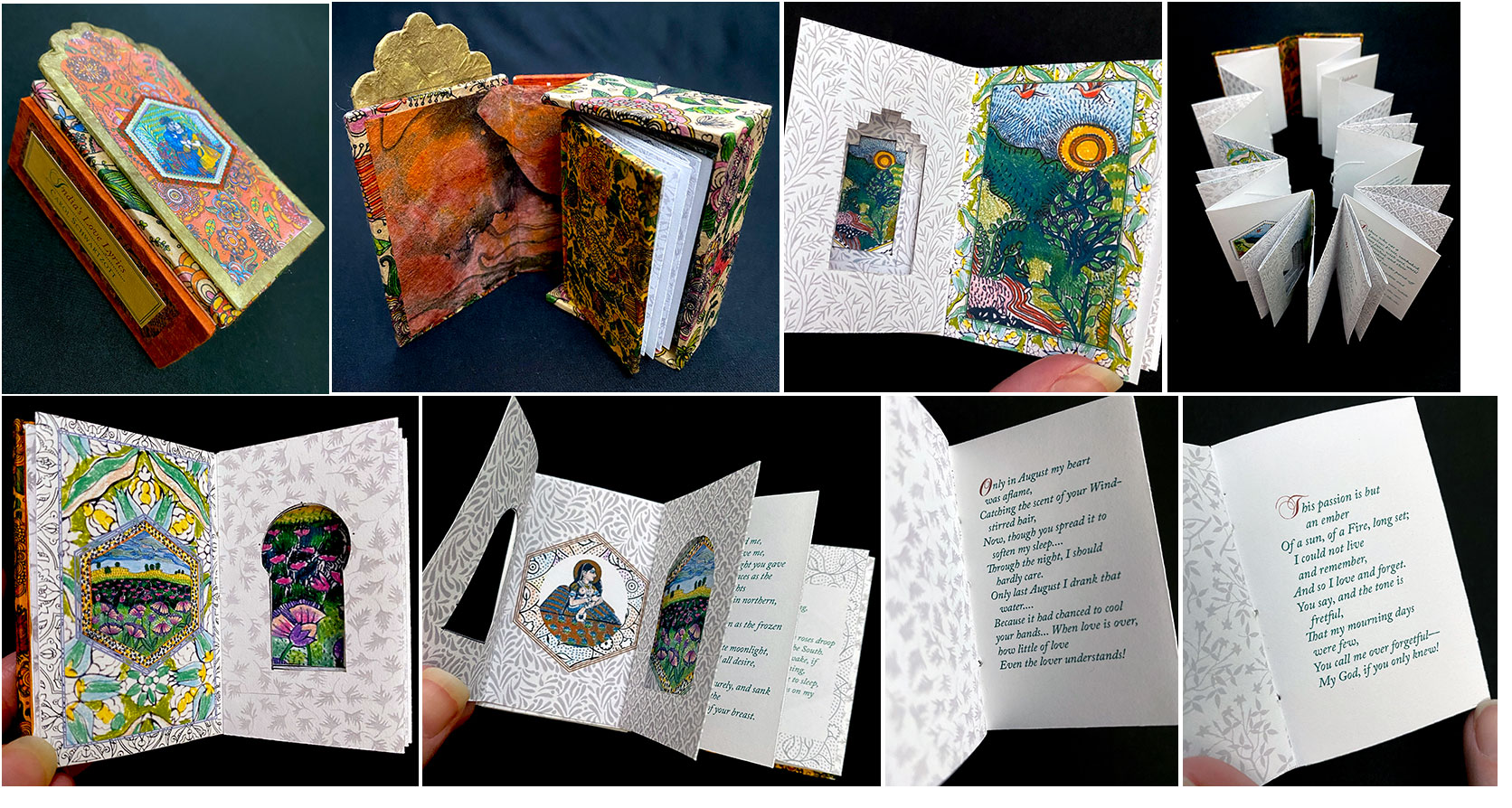 “The text consists of seven poems and uses Chopin Script for all the elegant drop caps, and Adobe CaslonPro for the text. Digitally printed on Mohawk superfine vellum, the seven illustrations are combinations of line drawings with additional pattern collage, a more modern approach to the classic Indian miniature. They have been hand-colored and reduced via scanning and transforming on computer. Bookboards and droplid box are covered with combinations of dyed, scanned and printed papers. The lid of the box is complete with a cut-out archway, a discard from my 2007 edition of the Rubaiyat. These tiny cardboard blanks were the remaindered interior pop-outs from the front piece of that cover...