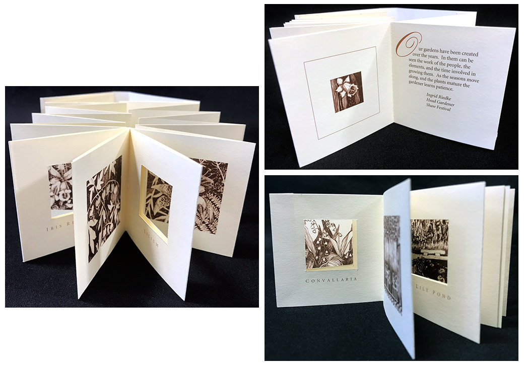| Carol Schwartzott: "The first miniature books I made were very small, one-of-a-kind pieces that I wish I still had.…They were very textural, with layers of gossamer papers, interesting images and sewing. A very good friend who was a gardener for the Shaw Festival Theatre in Canada saw them and suggested I come up with an idea for a little book about the Shaw grounds. After playing with ideas, pricing, packaging, etc. I came up with the format that I later used for … books. These were all offset printed (Edition 500) and the printer cut them down and scored them for easy folding. Each book had something handmade about it." |