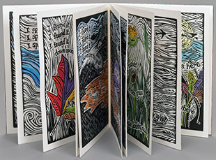 4 x 6" closed, extends to 14"; 14 pages. Accordion fold. Hand-printed with thermal screens, paper lithography and botanical prints. Copper leaf on Stonehenge paper and kozo chine-collé, copper leaf. . Copper Plate cover. In cloth bag with ribbon closure. Signed and numbered by the artist and poet.