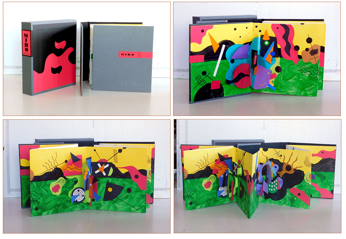 This pop-up and accordion book by Howard Munson was inspired by the work of Miro. His influence is shown in the organic forms and wonderful color palette of the pop-ups and background.