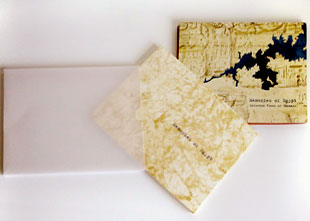 "This book tries to convey the explosion of information that overwhelms and fascinate travelers like me who visit Egypt for the first time. The photo-montages as well as the loop structure of the book demonstrate how difficult it is to connect all the information pertaining to the area: geographically (with the maps of Northern and Southern Egypt, made from aerial maps) and culturally (the series of photographs of bazaars). Since the majority of the territory is desert, the book's covers have been treated to allow the reader to feel the roughness of the sand and the smoothness of the water. Memories of Egypt is a yellow (the desert) and blue (the river) book that will carry the reader on a tactile and visual trip along the Nile."