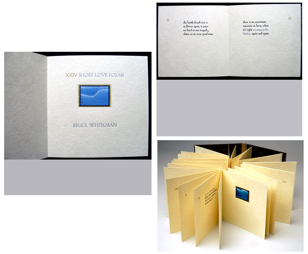 10.5 x 5.25"; 28 pages. Signed by Alan Loney. Design, presswork, embellishment, and binding by Carolee Campbell whose photographs line both front and back boards.