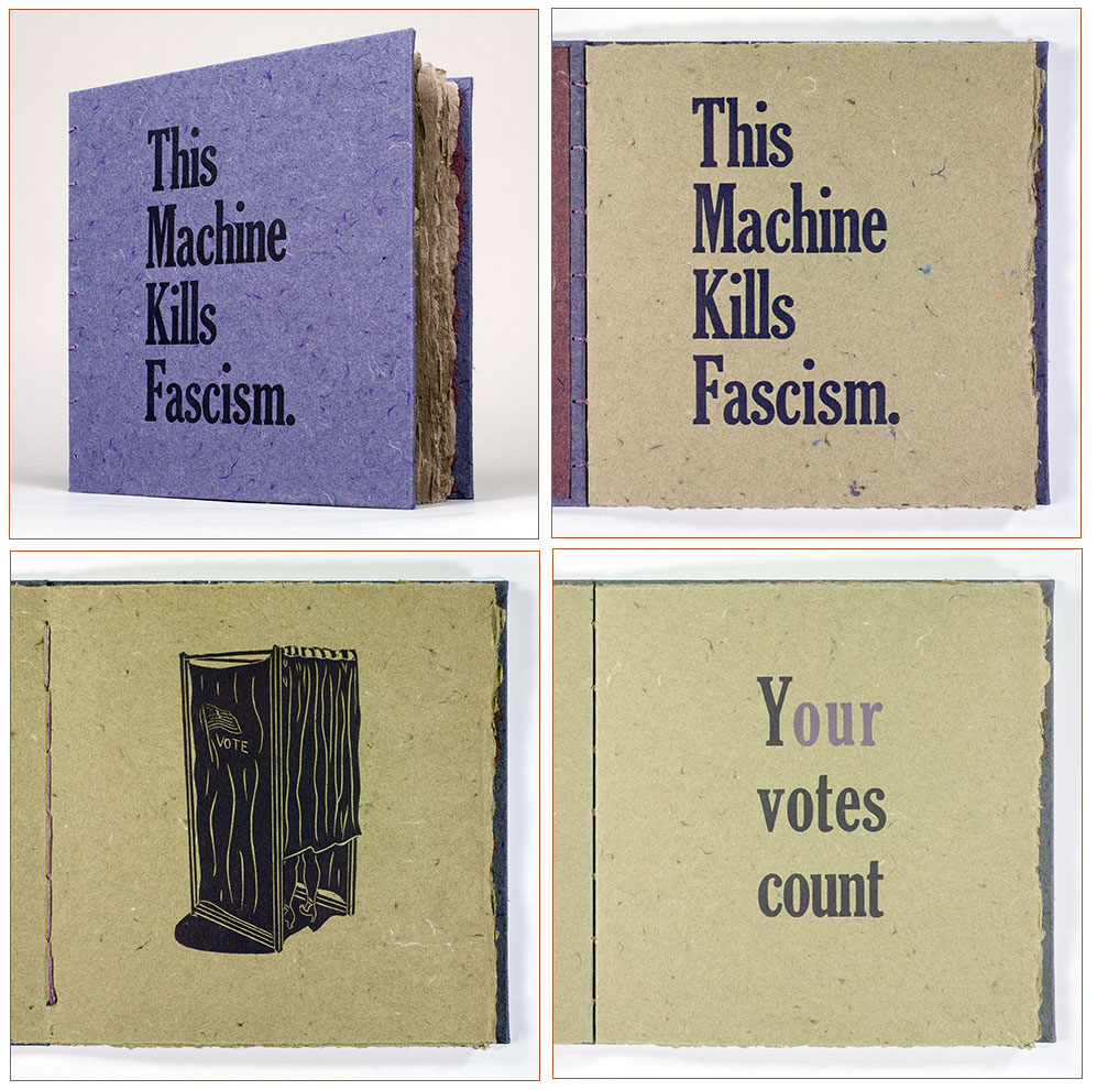 6.25" x 6.25"; 20 pages. Pamphlet binding. LaserJet printed on 50lb., double-sided, matte Red River Paper. Garamond typeface. Bound in quarter cloth. Paper covered boards of handmade cotton rag paper printed on an etching press using a polymer plate from Boxcar Press in Syracuse, New York. Signed and numbered by the artist on the colophon.