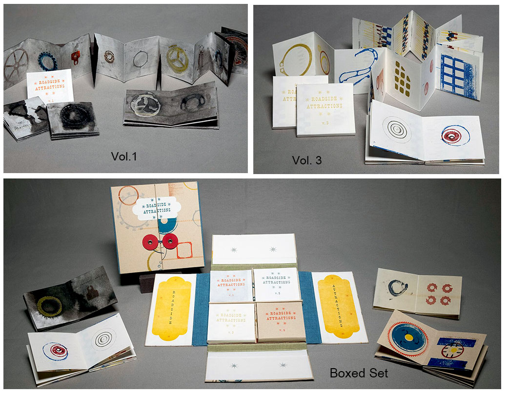 Marnie Powers-Torrey: "Roadside Attractions documents collected evidence, inviting the reader to draw individual conclusions on the quasi-environmental study conducted by the artist. The small boustrophedon forms take notice of the intricacy of waste that proliferates at America's roadsides. Each book is a grid of micro-meditations that attempt to balance human being's misuse of resources with our incredible ingenuity and progress. The prints document tiny indicators of how we thrive and falter —each micro page a critical piece of an unknown something. The books' structure invites the viewer to map these discarded pieces without promise of arrival at a final destination. Simultaneously, the viewer is engaged in hypothesizing about the broken objects' former uses. ... The deluxe set travels in a box that opens like the back of a caravan wagon, taking goods and entertainment on the road."