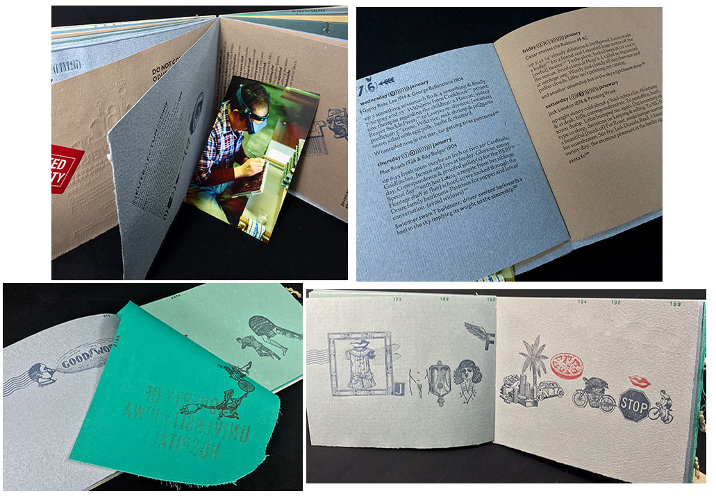 28 x 18.5 cm (11 x 7"); 52 page surfaces (40 printed). Letterpress printed on a Vandercook using several colors. Printed on Evergreen Script, Biblio, and Gutenberg papers. Sewn-boards binding with marbled paper in front and an exposed structure in back. Typewriter keyshaft attached. Press numbered. Signed by author and printer. Prospectus laid in.