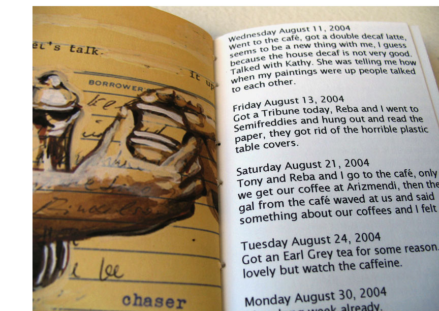 4 x 2.75"; 26 pages. Three signatures, inkjet printed and hand-sewn into a heavy cardstock cover with cutout windows revealing images of a coffee drinker and a coffee cup. End pages are of used coffee filter. Materials: coffee filter, postcard.