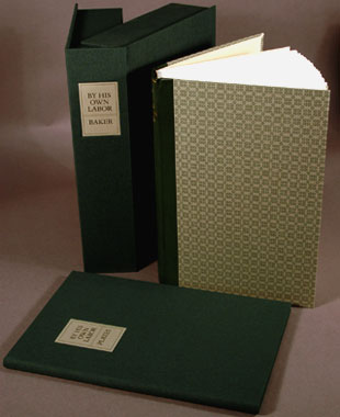 2.75 x 2.75"; 24 pages. Miniature. Letterpress printed. Type is Scala Pro and Scala Sans Pro. Printed on Mohawk Text paper. Handbound in Khadi Indian handmade paper wrappers with green endpapers. Signed and numbered by the artist.