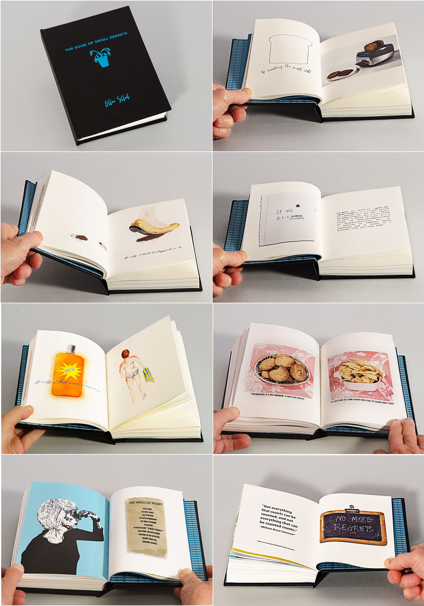 6.25 x 5.25"; 136 french-fold pages. Digitally printed on Mohawk Superfine by Girlie Press. Includes hand drawn and water color images, photographs and text. Free end page and paste done with “small regrets” printed in multiple lines in white over blue paper. Hard case bound in black linen with a metallic foil stamp on the front cover and spine. Binding by Phil's Custom Bindery. Illustrations, photography, writing and design by T. Ellen Sollod. Signed and numbered by the artist.