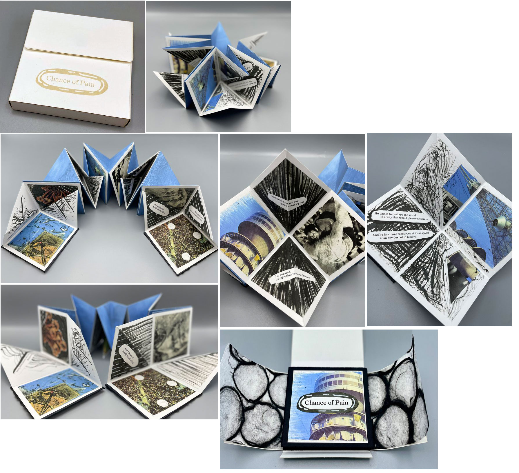 Gatefold opening. 11.5” x 16.75” x 6” open; 11.5” x 16.75” x .25” closed. Acrylic ink, xerography, typewritten text, collage on Okawara paper. Stab binding on each side with thread. Covers of painted paper over binder’s board. Signed by the artist.