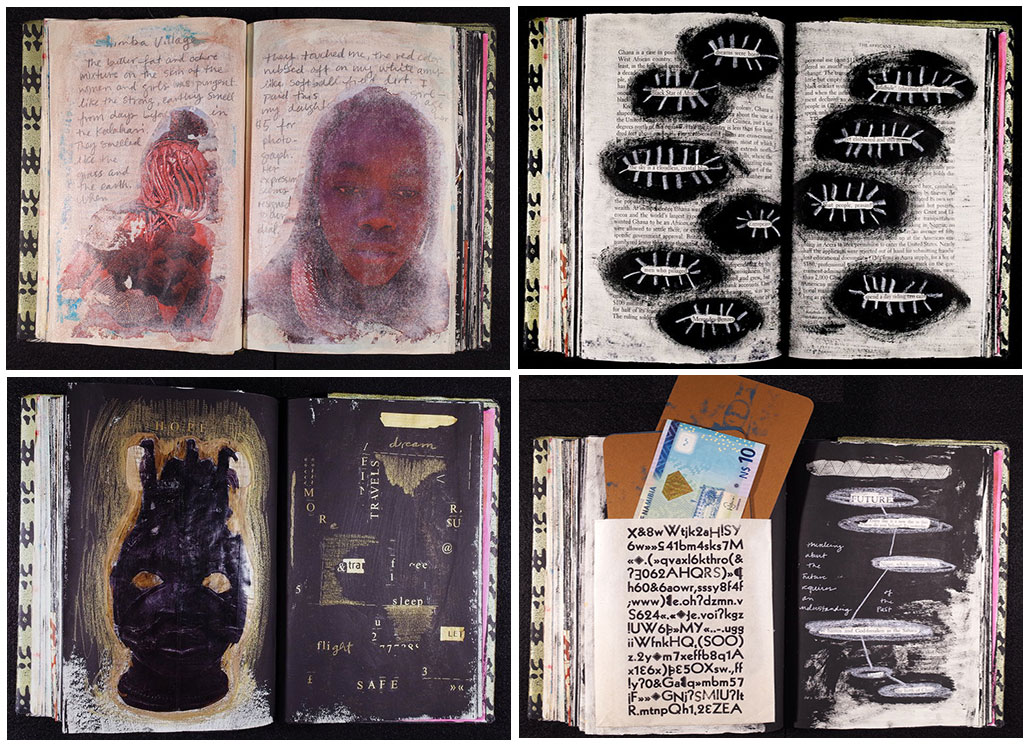 "The book I altered was a memoir written in the 1980’s by journalist David Lamb titled 'The Africans.' His narrative as a western journalist and humanitarian evoked perceptions of Africa from my childhood when many Americans viewed it only as place of pervasive hunger, poverty and war. Revisiting these ideas of past and present gave shape to my process of alteration. I brushed pages with either black or white gesso to both silence and emphasize the original text, and added collage and drawing. On the trip, I wrote journal entries as we bumped down long gravel roads along the Skeleton Coast. I photographed and drew Namibian tribespeople, villages, sand dunes, elephants, and shipwrecks and upon my return, placed these images into the book along with my written observations and reflections. "