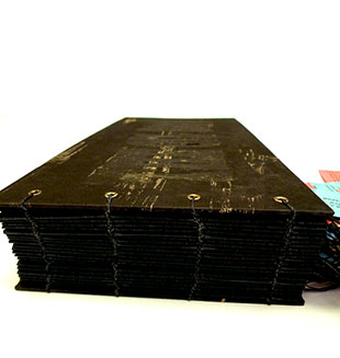 9 x 12"; 32 pages. Hardcover stab-bound book. Screen-printed cloth covers. Mixed media pages with interactive elements. Sewn binding.