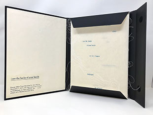 9.125” x 12.125” x .5”; 10 leaves. Unbound. Letterpress and screen printing on unbleached Mulberry paper. Enhanced with stitching across the leaves. In hard cover overlap folio with velcro closures. Signed and numbered by the artist.