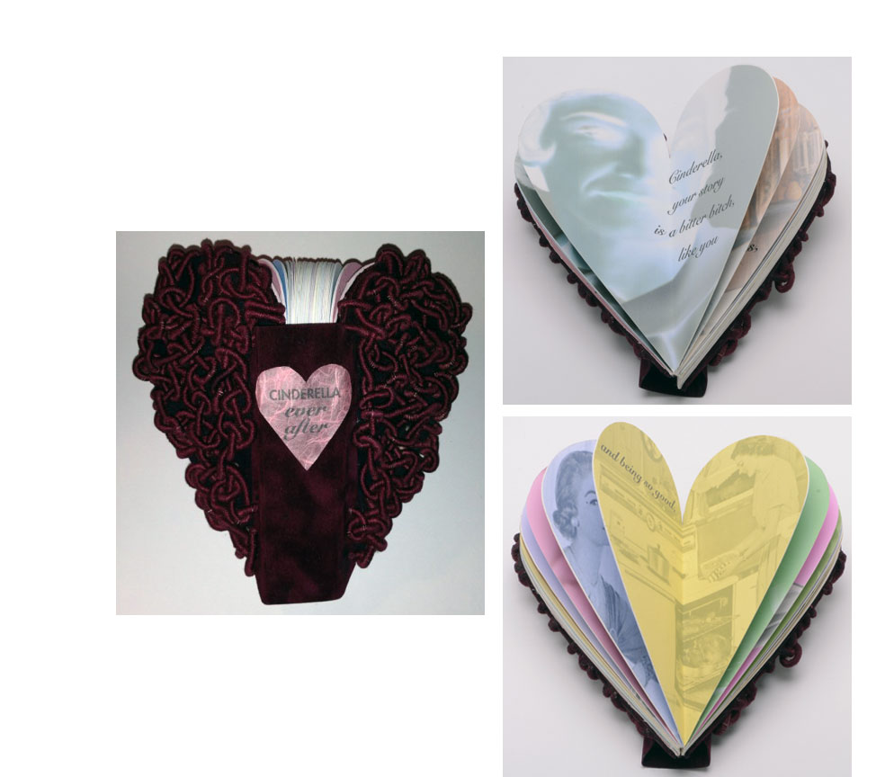 "The shape of the book refers back to medieval codex structures, in which heart shaped books were often used for prayer, and to reflect a love of god. Cinderella Ever After contains a different sort of prayer by a narrator who urges Cinderella to flee from her prescribed path, and to change into 'someone you can recognize.' Florio's text contrasts the myth of happy ever after against the reality of finding one's self."