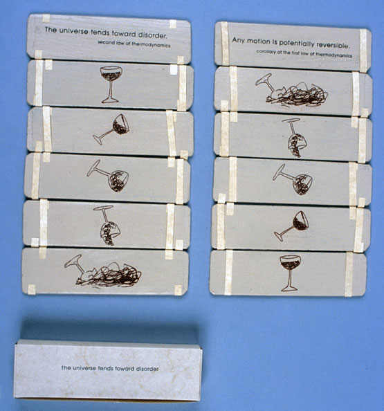 On one side of this Jacob's ladder is printed the second law of thermodynamics ("the universe tends toward disorder"); and, below that a sequence of images of a wine glass tipping, falling, and breaking. When one activates the piece, the slats seem to fall, the back is brought to the front; and, thus, "the universe tends toward disorder" is replaced by another law's corollary. "Every motion is potentially reversible" brings with it corresponding images of the broken glass and spilled wine reconstituting itself. Only one side of the ladder is readable at a time. The sides being mutually exclusive, embodying the perception of the impossible tension between the two principles.
