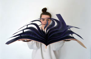 9.25 x 13.75 x 3.5" closed, 9.25 x 28.75 x 3.25" open; 6 folded pages. Letterpress. Laser cut. Laser engraved. Materials: paper, felt, ripstop nylon, silky solid polyester, knit, rabbit fur, birch plywood. Numbered on the colophon.