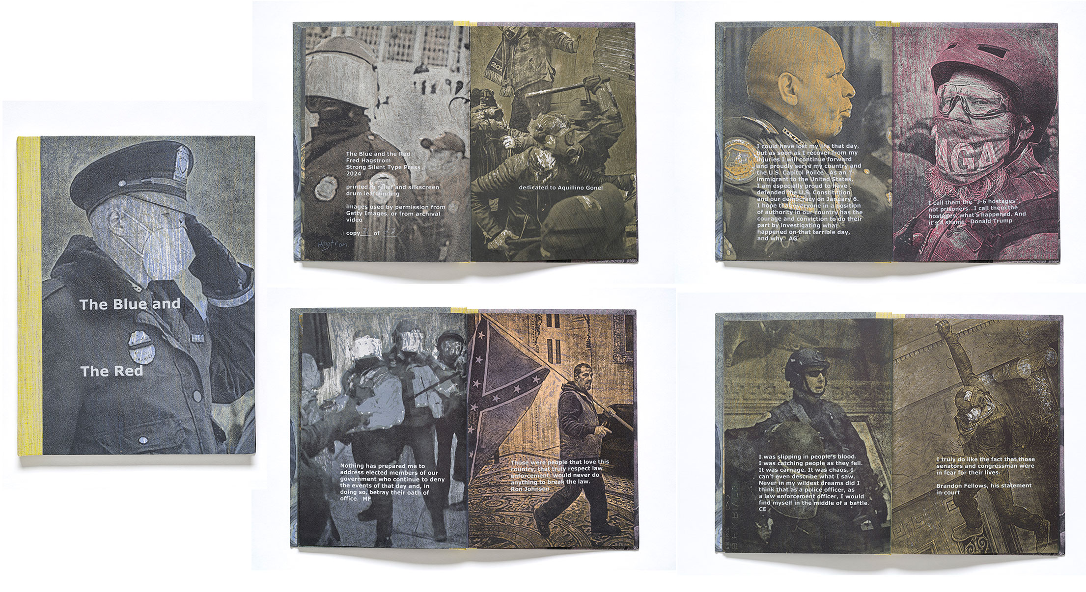Fred Hagstrom: "’The Blue and the Red’ uses archival photographs from the January 6th attack on the capitol, coupled with comments by the Capitol Police, convicted rioters and politicians who spoke in support of the attack. Much of the text comes from congressional or court testimony, while the quotes from politicians come from media sources."