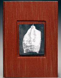 11 x 13"; 18 pages. Intaglio images from plastic plate in three colors. Text printed letterpress from polymer plates. Base paper Rives Gray. Images applied chine collé on Iwaki paper. Codex binding. Black cloth covered boards with intaglio print on front board.